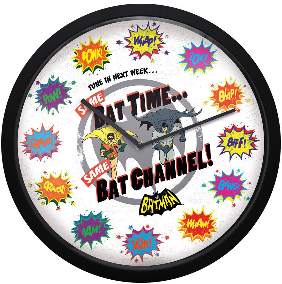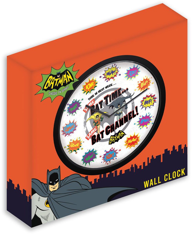 30,5 cm:n seinäkello Fanattikilta, jossa on lasinen yläosa ja alumiiniset viisarit. Suljettu vitriinirasia. Kunnianosoitus klassiselle Batman-sarjalle, tämä retrotyylinen kello sopii kaikille alkuperäisen sarjan faneille.