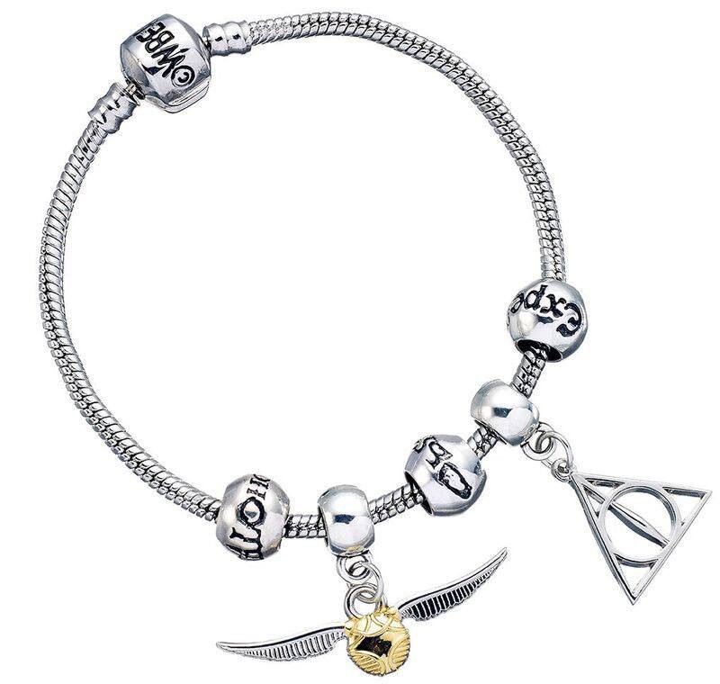Official Harry Potter Deathly Hallows and Snitch charms on a Silver Plated Charm Bracelet with three Spellbeads.