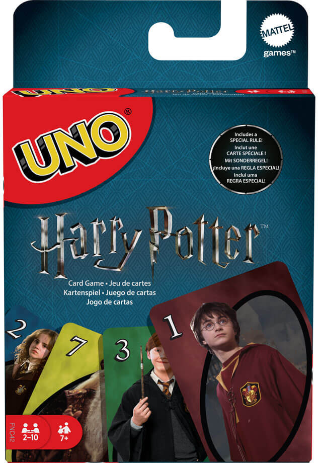 It's the fun, fast-paced card game you love now featuring iconic characters from the world of Harry Potter! Join Harry, Hermione, Ron, Professor Dumbledore and more of your favorite characters from Hogwarts for a night of UNO™ gameplay. Players race to get rid of all their cards by matching a card in their hand with the current card shown on top of the deck. Score points by being the first to get rid of all the cards in your hand. Special action cards deliver game-changing moments as they each perform a function to help you defeat your opponents. There's even a special Sorting Hat Rule Card! When you play this card, another player of your choice must keep drawing cards until they find a Gryffindor card! Other action cards include Skips, Reverses, Draw Twos, and Wild Cards. First player or team to 500 wins - and when you're down to one card, don't forget to yell "UNO!" A great gift for Harry Potter fans, age 7 and older. Contains 112 cards plus instructions.