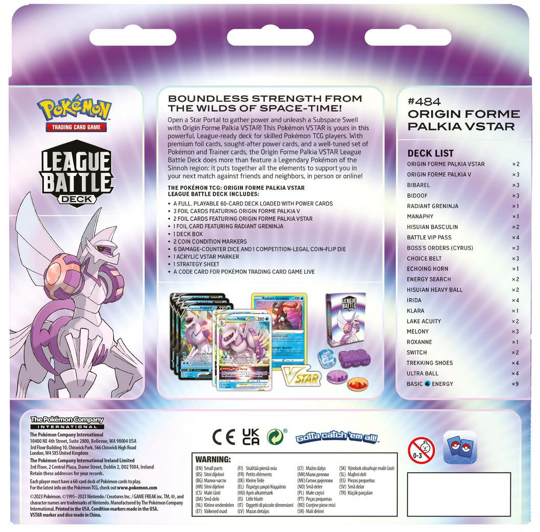 The Pokémon TCG: Origin Forme Palkia VSTAR League Battle Deck includes: