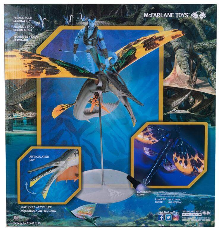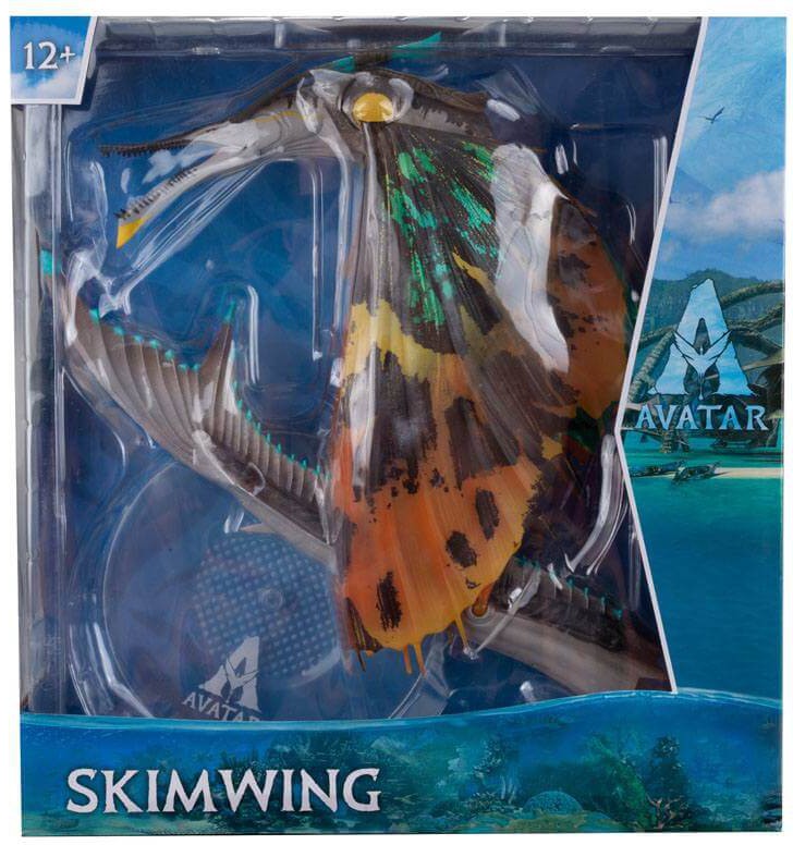 Similar to the Banshee with its sleek body and colorful wings, the Skimwing is Pandora's large flying fish. It possesses menacing, needle-like teeth and a long snout allowing it to scoop smaller fish out of the water while in motion. Fully articulated with an incredibly high level of detail, this Mega Skimwing can be posed to swim or fly as seen in the film Avatar: The Way of Water and works with 7-inch Na'vi figures as riders. It also features an articulated jaw, poseable wired tail, bioluminescent effect when placed under black light, and special collector stand to display your incredible Skimwing!