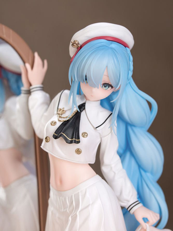 She wears her hair in a braided ponytail, and the long blue strands cascade over her left shoulder. Her hair is in gradient color that transitions from blue to translucent. Her reflection in the full-length mirror adds a touch of realism and additional charm to the figure.