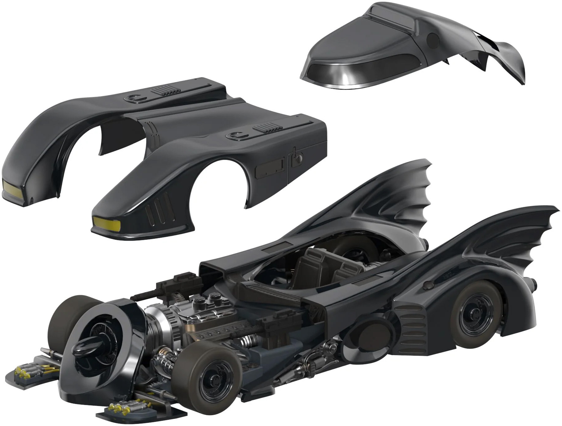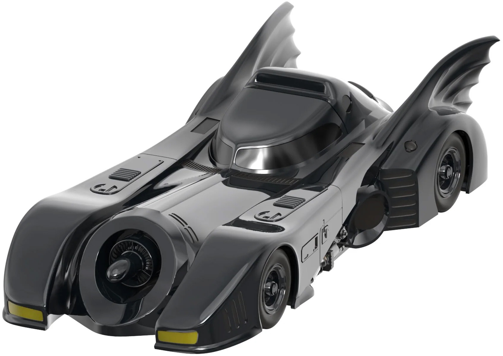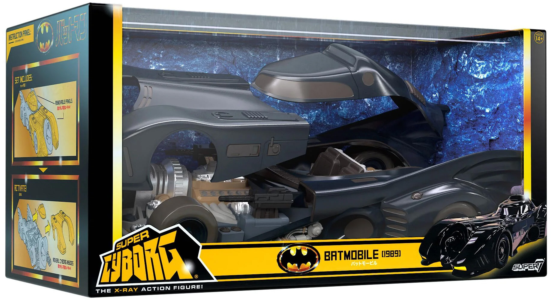 Batman utilizes an arsenal of high-tech gadgets and vehicles in his fight to protect Gotham City, and none are more iconic than the Batmobile! Appearing in every iteration of Batman and evolving with the character over time, Super7 is proud to present the Batman (1989) Batmobile Super Cyborg! Measuring over 13" long and 5" wide, this Batmobile is inspired by its appearance in the 1989 Batman film and is bursting with movie-accurate sculpt details and metallic paint accents. The formidable exterior of the vehicle features a spinning turbine fan, rolling wheels, and an array of sculpted details including machine gun casings, grappling hooks, dual batwing fairings, and more. Remove the pair of exterior panels on the top of the vehicle to expose the intricate inner workings of the Caped Crusader's crime-fighting vehicle, including a supercharged V-12 engine flanked by twin forward-mounted machine guns, a cockpit with detailed telecommunications array and rotating steering wheel, rear-mounted oil slick dispensers and smoke emitters, and a turbine exhaust afterburner. Upgrade your collection as quickly as Batman dispatches evil-doers by adding this (1989) Batmobile Super Cyborg!