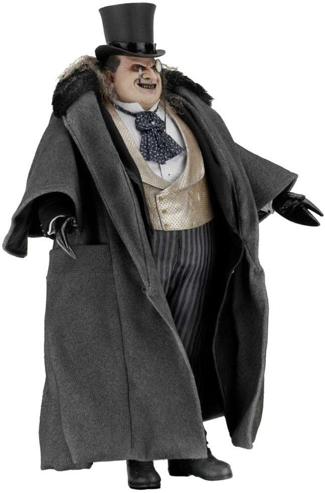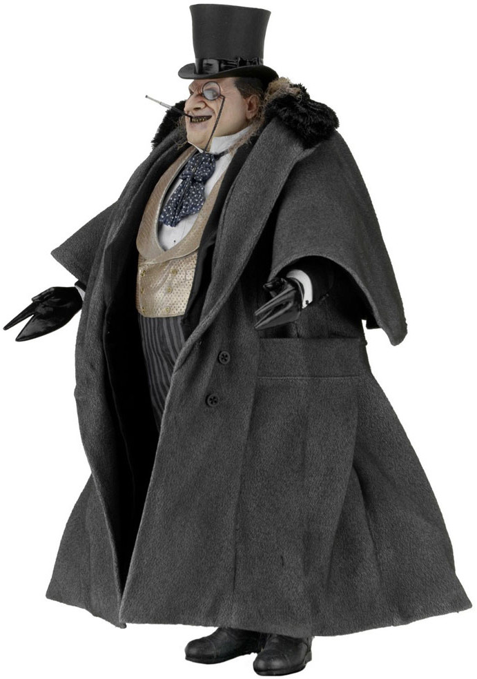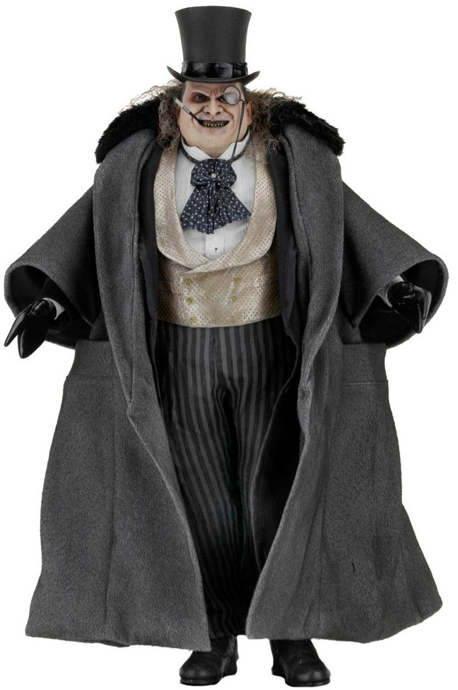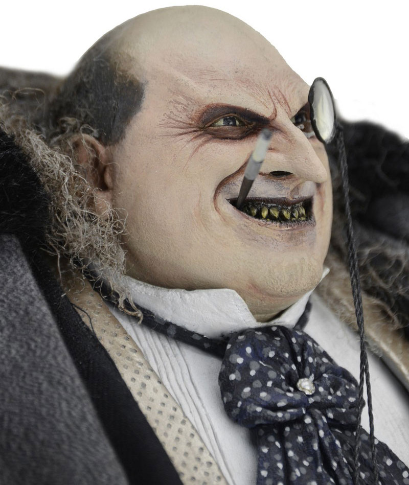 The 1/4 scale action figure features the likeness of actor Danny DeVito, whose memorable performance as the twisted Oswald Cobblepot in the 1992 movie still defines the character. The fully poseable figure stands 38 cm tall and features synthetic hair and a movie-authentic sculpt. Penguin comes with an all-new removable fabric coat, removable top hat, "Cobblepot for Mayor" mini-poster, monocle, cigarette in holder and half-eaten fish accessories.