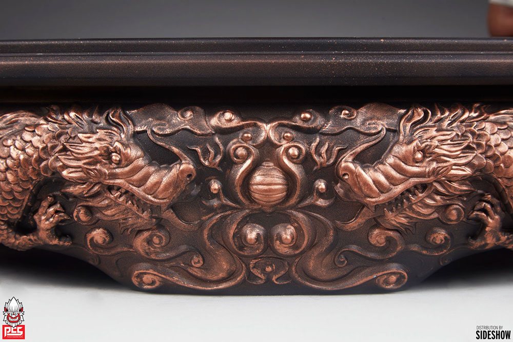 Inspired by an iconic era of his prolific career, the Bolo Yeung: Kung Fu Tribute 1:3 Statue is a mixed media collectible with a fully sculpted athletic physique costumed with red and black fabric shorts and a red fabric belt. The hanging tails of the white and red headband sculpted onto his portrait are also fabric for added realism. Standing on a bronze-colored base with dragon detailing, he strikes a wide stance and stays light on his taped feet in preparation for another fight. Bolo Yeung's furious expression is framed by shaggy black hair, and his flexing muscles indicate that he is a formidable foe and a perfect centerpiece for any fan's action movie display.