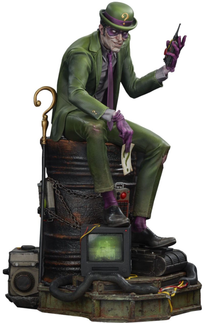 The Riddler Premium Format Figure measures 19.5" tall, 11.8" wide, and 14.3" deep as an egotistical Edward Nygma taunts Batman from atop a lacquered black barrel. Sinewy and sociopathic, the master strategist holds a paper riddle in one hand and a detonator in the other. The Riddler has purposefully put himself front and center in this rusted warehouse. Clues and threats — including Wayne Tower security footage and blueprints, an electronic keypad, a question mark cane, generators, gasoline drums, chains, and wires — are piled high. Now Riddler's got Batman right where he can see him put together all the puzzle pieces ... or die trying.
