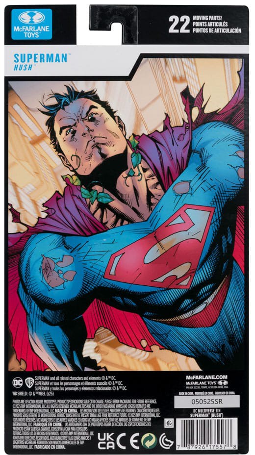 DC Multiverse -toimintahahmo Superman (Hush) McFarlane Toysilta on yksityiskohtainen ja nivelletty hahmo, joka perustuu Supermanin ikoniseen ulkoasuun "Hush"-sarjakuvasta.
