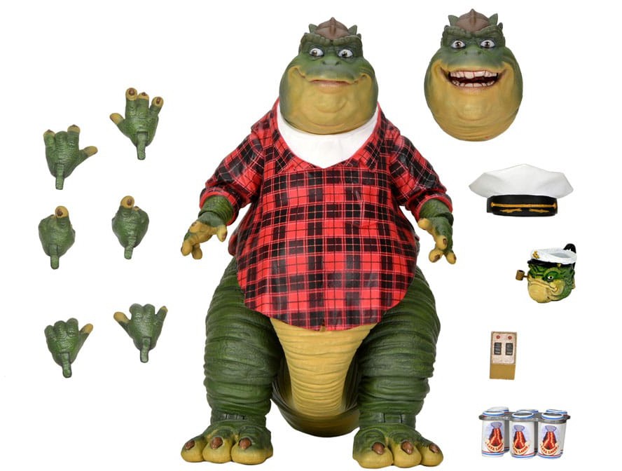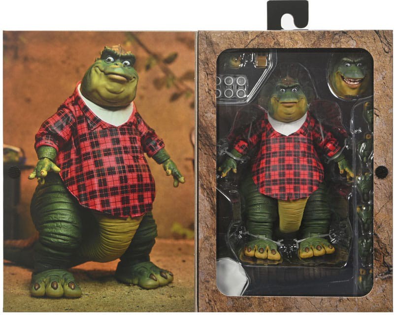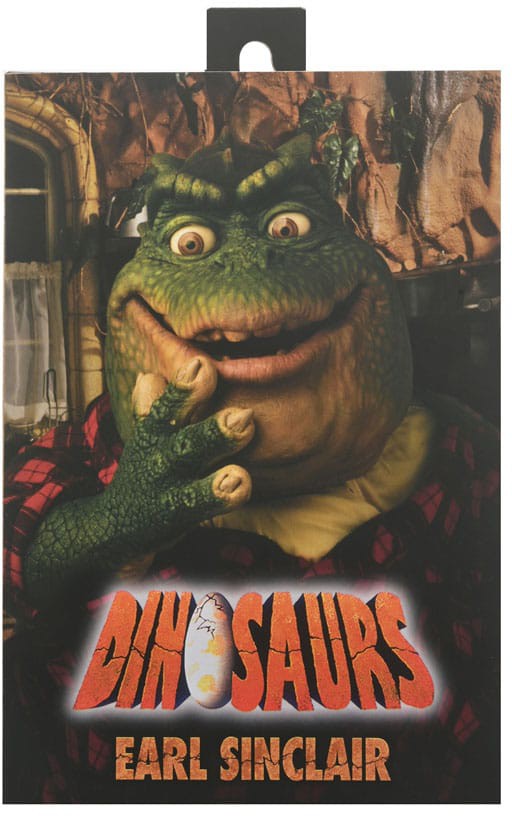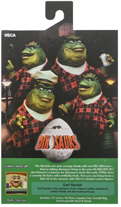 The Sinclairs are your average family with one BIG difference... they're talking dinosaurs living in the year 60,000,003 BC! Jim Henson's creatures for Dinosaurs made this early 1990s show a comedy hit that's still certifiably fresh. Now you can bring home a little bit of the prehistoric with NECA's detailed action figures. This 7" scale Earl Sinclair action figure is fully articulated (including tail) and packed with accessories: includes TV remote, beverage cans, captain's hat, Fernhill mug, interchangeable head and hands, and more. Collector-friendly window box packaging with opening front flap.