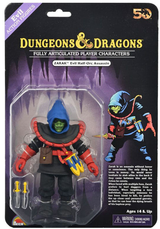 Celebrate the 50th anniversary of Dungeons & Dragons with NECA and WizKids! For this special occasion, we have reimagined the classic Zarak action figure release for the modern collector's market, with special touches to celebrate 50 years of D&D. Featuring a retro paint deco, the evil assassin Zarak fights for coin with a fearsome set of daggers which fit into the sheaths on his belt. This fully articulated 50th Anniversary Zarak action figure comes on blister card packaging that is a tribute to the original release.
