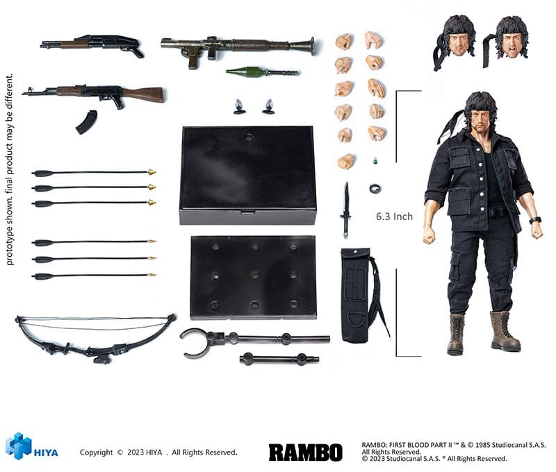 We are proud to announce the Rambo 1/12 scale action figure from First Blood. Hiya Toys [EXQUISITE SUPER] as 1/12 scale high-end action figure series, dedicated to polishing every detail and shape only to pursue higher quality and better experience. EXQUISITE SUPER Rambo is a 160 mm tall, fully-articulated collectible figure featuring a custom designed body.The upper torso is designed in one piece, with built-in joints at the neck, chest and waist. Include 6x interchangeable hands, 2x interchangeable head, and various weapon accessories to help Rambo survival and resist his pursuers.