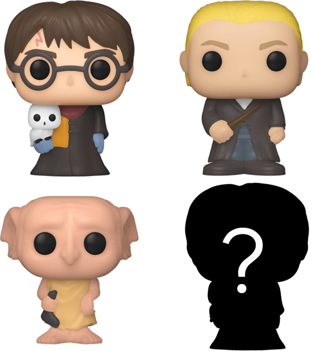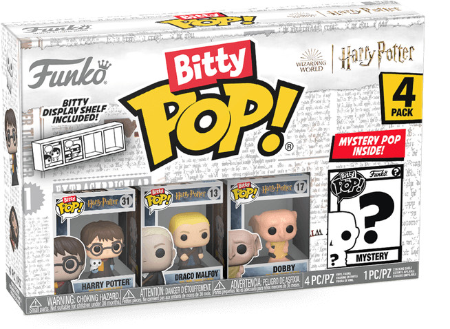 Tämä 4-pack sisältää Bitty Pop! Harry Potter, Bitty Pop! Draco Malfoy ja Bitty Pop! Dobby sekä salaperäinen Bitty Pop! hahmo. Mahdollinen salaperäinen Bitty Pops! hahmot ovat Hyper Rare (1/6) Harry Potter (Quidditch), Hyper Rare (1/6) Hedwig, Rare (1/3) Fawkes ja Rare (1/3) Severus Snape.