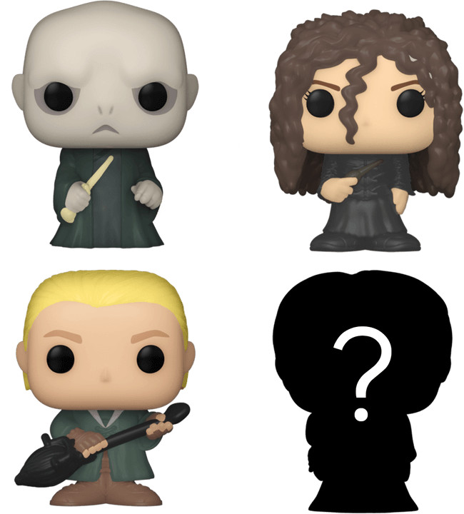 Tämä 4-pack sisältää Bitty Pop! Lord Voldemort, Draco Malfoy (Quidditch), Bellatrix Lestrange, sekä salaperäinen Bitty Pop! hahmo. Mahdollinen salaperäinen Bitty Pops! hahmot ovat Hyper Rare (1/6) Harry Potter (Quidditch), Hyper Rare (1/6) Hedwig, Rare (1/3) Fawkes ja Rare (1/3) Severus Snape.