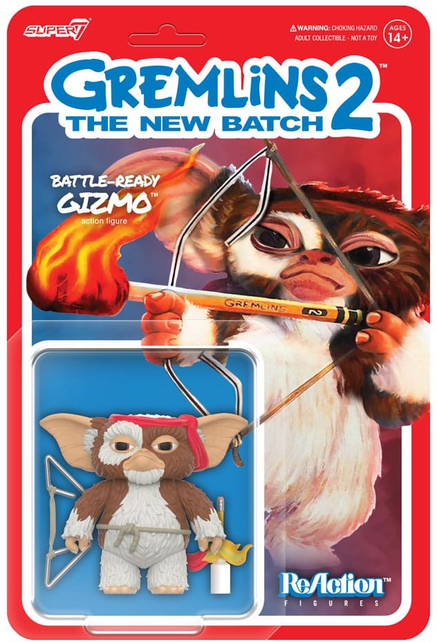 Gizmo is all geared up for action! The new 3.75" scale, articulated battle-ready Gizmo ReAction Figure, inspired by the 1990 film Gremlins 2: The New Batch, brings the movie's hero to life like never before. With film-accurate details, Gizmo is ready to defend himself-and your collection-with his pencil and paperclip bow and arrow accessory! Packaged on a full color blistered cardback, this figure is the perfect addition to any Gremlins fan's