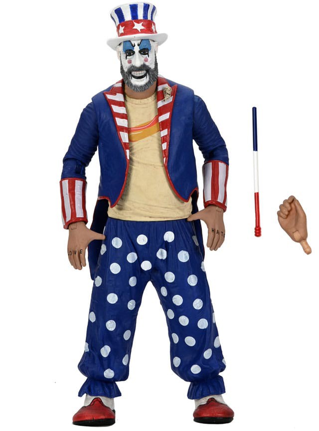 Stop by Captain Spaulding's Museum of Monsters and Madmen - it's fun for the whole family! (If you're the Manson family!) Celebrate the 20th Anniversary of Rob Zombie's movie House of 1000 Corpses, which featured gas, food, murder, and the most shocking tale of carnage ever seen. This 7" scale Captain Spaulding action figure is dressed in red, white and blue ringmaster attire and comes with hat, baton and interchangeable hand. Commemorative 20th Anniversary window box packaging.