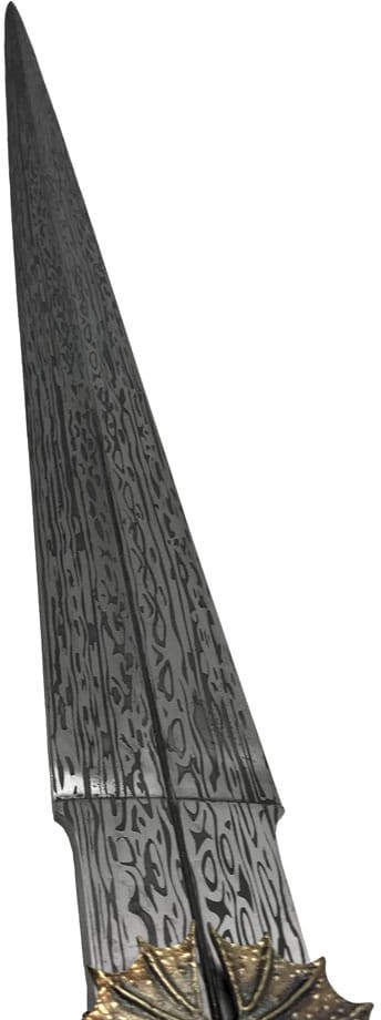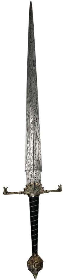 ”Targaryenin on istuttava Rautavaltaistuimella.” Viserys I Blackfyre on yksi Targaryenin suvun muinaisista Valyrian-teristä. Se on periytynyt monille Targaryenien suvun merkittäville jäsenille, ja alun perin se kuului Targaryenien dynastian perustajalle Aegon Valloittajalle. Kuningas Viserys I käytti sitä vallan symbolina, ja Blackfyre on äpärämiekka, joka on saanut lempinimen puolitoistakätisen mittasuhteensa vuoksi. Sen leveä terä on sekä hyökkäykseen että puolustukseen suunniteltu ”hakkuri”. Lohikäärmeen talon aseistajamestari Tim Lewis tilasi maailmankuululta miekkaseppä Peter Johnssonilta alkuperäisen Blackfyre-sankariproteesin. Peter on todellinen mestari käsityössään, ja hän on myös historioitsija, jolla on vertaansa vailla oleva tietämys muinaisesta miekkailutaidosta. Hänen asiantuntemuksensa ansiosta Blackfyre sai autenttisen luonteen ja perinnön. Factory Entertainmentin Blackfyre-replika luotiin sankarin rekvisiitan huolellisen tutkimisen jälkeen. Tiimimme haastatteli sekä Peter Johnssonia että Tim Lewisia, jotka molemmat antoivat runsaasti ennen näkemätöntä tietoa kulissien takaa, mukaan lukien yksityiskohtia ja valokuvia alkuperäisen rekvisiitan rakentamisesta. Olemme hyvin kiitollisia heidän avustaan ja panoksestaan. Kukin jäljennös on tehty käyttäen samanlaisia perinteisiä tekniikoita kuin alkuperäinen sankari, mukaan luettuna hukkavahavalu. Myös materiaalit, kuten puu, nahka ja metalli, on valittu samankaltaisiksi. Sankarin rekvisiitassa käytetyn damaskoteräksisen terän ulkonäön jäljittelemiseksi Factory Entertainment -tiimi valitsi korkealaatuisen En42-jousiteräksen, jonka kuvio on syövytetty kemiallisesti terään. Jokaisessa jäljennöksessä on juoksevasti numeroitu seinälle ripustettava laatta, ja se toimitetaan värillisessä laatikossa, jossa on aitoustodistus. Painosmäärä: 500 kappaletta.