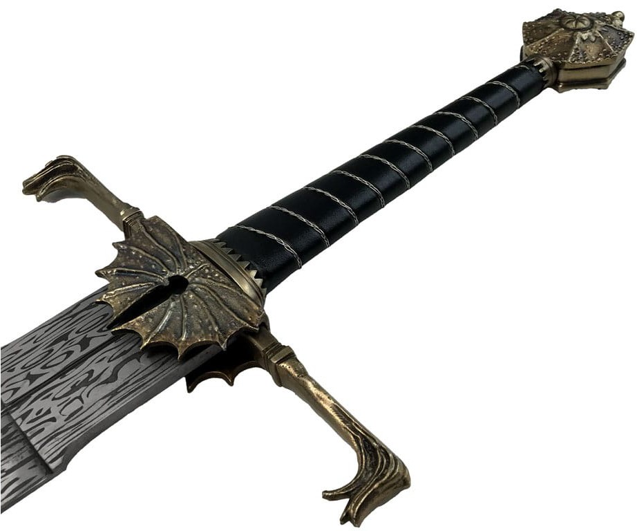 "A Targaryen must be seated on The Iron Throne." Viserys I Blackfyre is one of the ancestral Valyrian blades of House Targaryen. Passed down through the hands of many prominent members of the Targaryen line, it originally belonged to Aegon The Conqueror, founder of the Targaryen dynasty. Wielded as a symbol of power by King Viserys I, Blackfyre is a bastard sword, so nick-named because of its hand-&-a-half proportions. Its wide blade is a 'chopper' designed for both offence and defense. Tim Lewis, Master Armorer for House of the Dragon, contracted world-renowned swordsmith Peter Johnsson to make the original Blackfyre hero prop. A true master of his craft, Peter is also a historian with unparalleled knowledge of the ancient art of sword making. His expertise imbued Blackfyre with an authentic sense of character and heritage. The Factory Entertainment Blackfyre prop replica was created after careful study of the hero prop. Our team interviewed both Peter Johnsson and Tim Lewis, who each provided a wealth of previously unseen behind the scenes information including details and photographs of the construction of the original prop. We are very grateful for their assistance and input. Each replica has been created using similar traditional techniques to the original hero prop, including lost-wax casting. Similar materials have also been chosen including wood, leather and metal. To replicate the appearance of the Damascus steel blade used on the hero prop, the Factory Entertainment team elected to use high quality En42 spring steel with a pattern that has been chemically etched into the blade. Each replica includes a sequentially numbered wall hanging plaque and is presented in a full color box with a certificate of authenticity. Edition Size: 500 pieces.