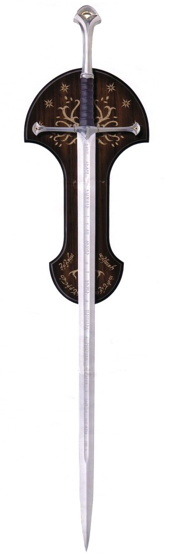 In the New Line Cinema film, The Return of the King, Anduril™ was reforged from the Shards of Narsil™ for Aragorn by elvensmiths in Rivendell. Elrond said of the legendary blade, The man who can wield the power of this sword can summon to him an army more deadly than any that walk this earth. The inscription down the length of the blade on both sides is in the Tolkien language of Quenya, written in the runes of Eregion, that say N‡ny‘ Andœril i nŽ Narsil i macil Elendilo. Lercuvanten i m‡li Mord—r‘o. This translates to I am Andœril who was Narsil, the sword of Elendil. Let the thralls of Mordor flee me. The blade inscription features runes framed by stylized symbols of the Sun and the Moon, which represent An‡rion and Isildur, the sons of Elendil, and seven symbolic stars that represent Elendil, who died wielding Narsil™ in battle against Sauron. Inscribed on the pommel are runes in the Elven language of Sindarin that say Narsil essenya, macil meletya; Telchar carneron Navarotesse. This translates to Narsil is my name, a mighty sword; Telchar made me in Nogrod.