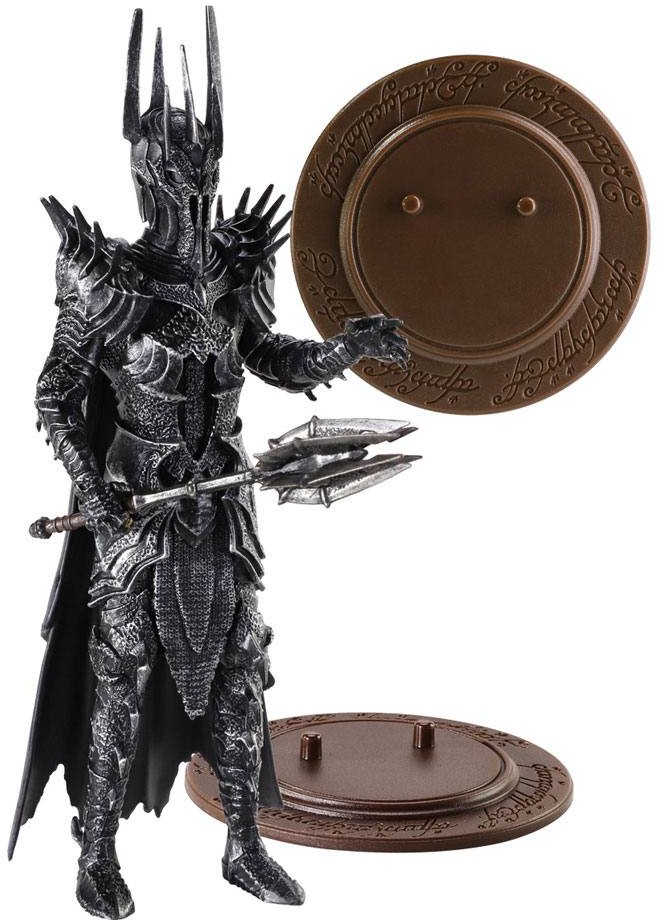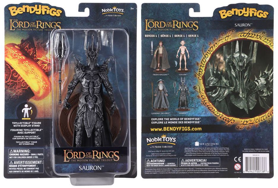 This fully posable figure stands approximately 7.5 inches in height. Sauron is presented as the character was introduced in the prologue to The Fellowship of the Ring, in full battle armour with his fearsome mace. As with the other figures in this range it comes a display stand emblazoned with the ring rhyme