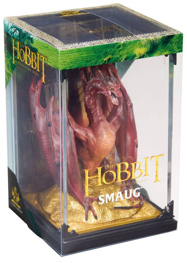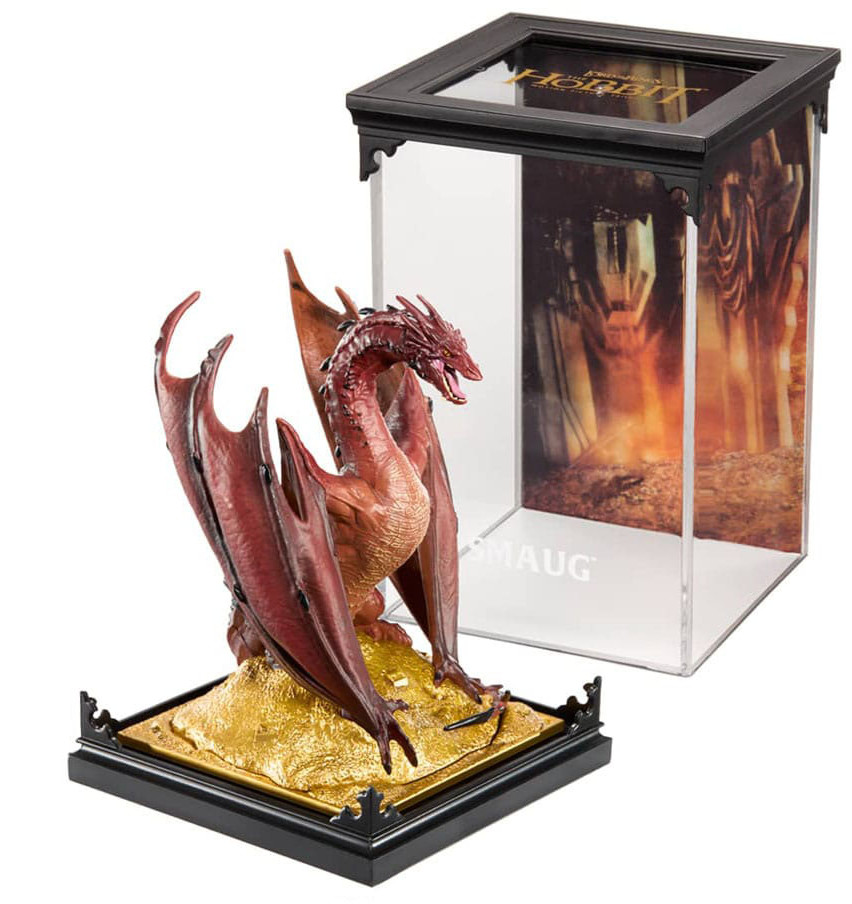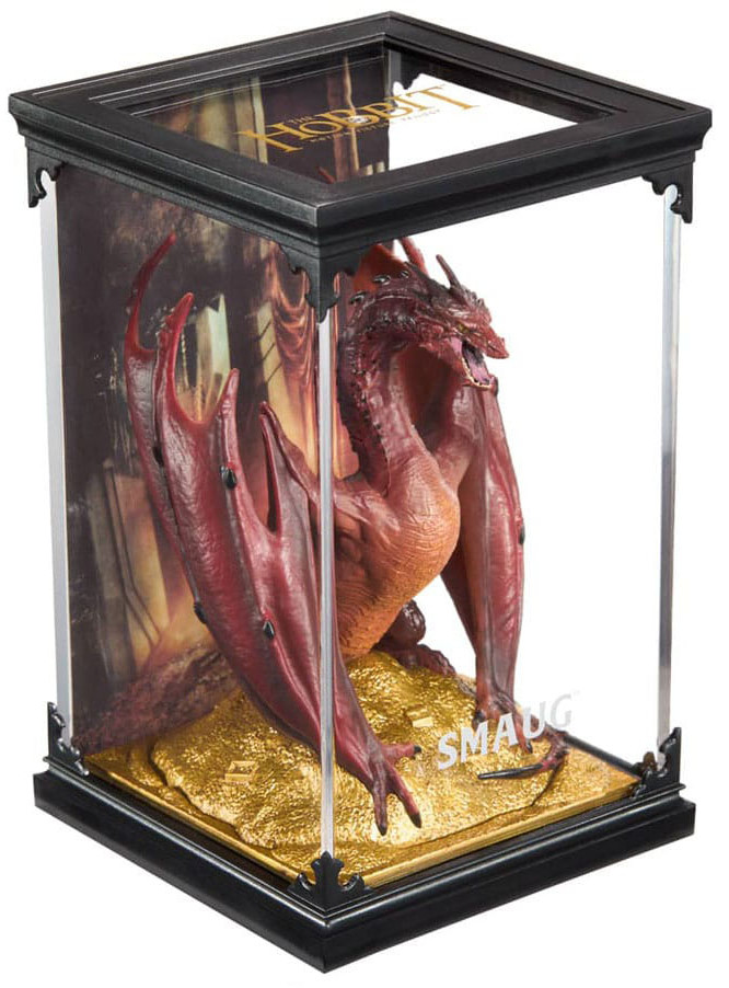 This three-piece diorama includes a lid with background, a base and a removable figure of Smaug. Measures approximately 17 cm in height. PVC figure in acrylic box.