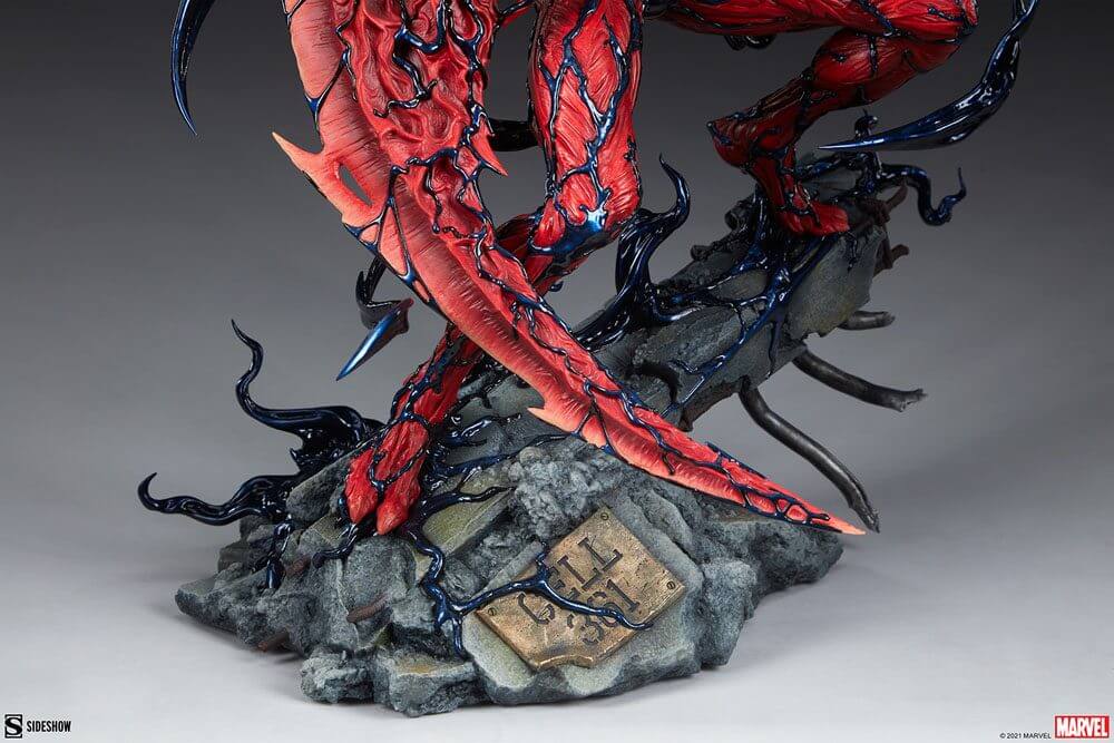 The Carnage Premium Format Figure measures 21" tall and 17" wide as Cletus Kasady breaks free of his prison cell at Ravencroft Institute, which features an Easter egg related to his comic book debut. The sociopathic symbiote has a massive scythe arm at the ready, smiling with glee at the prospect of an unstoppable killing spree. If this villain has his way, there certainly will be Carnage.