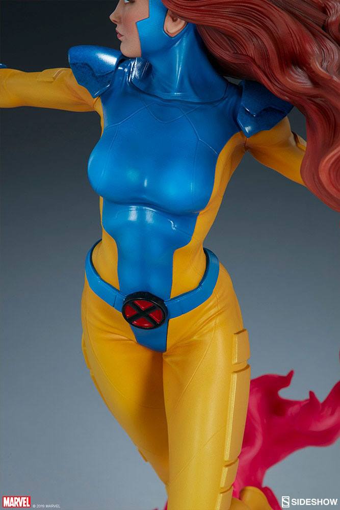 The Jean Grey Premium Format™ Figure features an entirely sculpted costume, inspired by her 90s era X-Men Gold team uniform. Jean has a sculpted yellow and blue bodysuit with detailed paneling and raised elements, along with blue gauntlets, shoulder pads, and an open cowl. At her waist, Jean Grey wears a red and black X-Men insignia buckle to complete her classic look, while her signature red hair flows dramatically behind her.