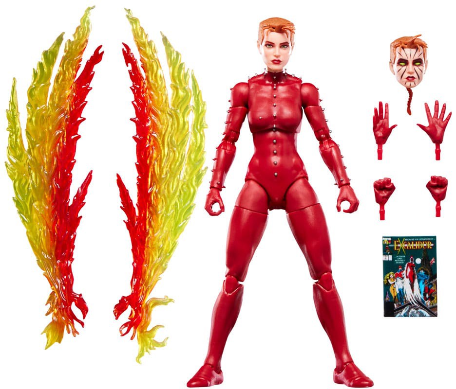 - Includes 8 accessories: 4 alternate hands, alternate head, Phoenix Force wings, and a 6-inch scale plastic comic book accessory featuring the cover of Excalibur #1 (1988)