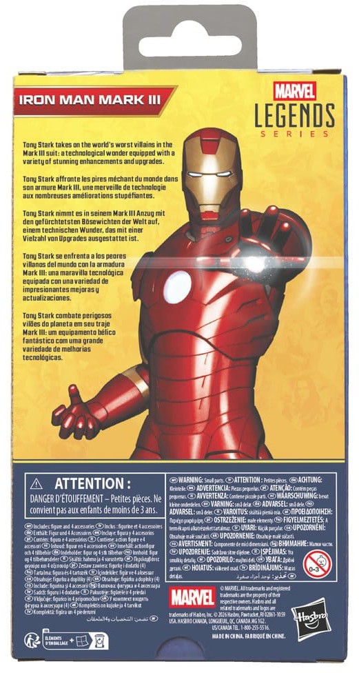 Tämä 6 tuuman mittakaavan keräilyhahmo esittää Mark III Iron Man -haarniskaa, sellaisena kuin se nähdään Marvel Studiosin Iron Man -elokuvassa. Hahmo sopii erinomaisesti sekä näyttäviin esillepanoihin että osaksi laajempaa Marvel Legends -kokoelmaa.