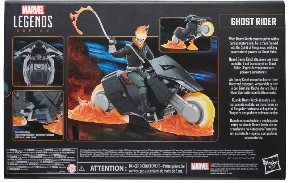 Setti sisältää Ghost Rider -hahmon, Hell Cycle -moottoripyörän sekä 9 lisävarustetta, kuten display-telineet moottoripyörälle ja ketjuvarusteen hahmolle. Marvel-toimintahahmot 6 tuuman mittakaavassa sopivat erinomaisesti poseeraukseen ja esillepanoon kokoelmissa.