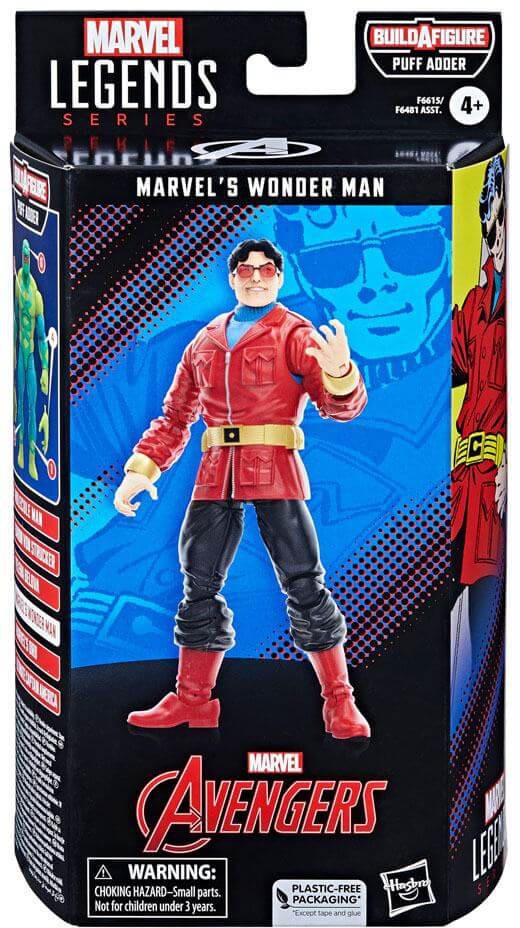 This collectible 6-inch-scale Marvel Legends Classic Comic figure is detailed to look like the Marvel's Wonder Man character clad in his red jacket costume with transparent red sunglasses from Avengers comics, featuring premium detail and multiple points of articulation. It comes with 4 accessories, including alternate hands and belt-jet thrust accessories that plug into the figure's belt; plus 2 Build-A-Figure pieces.