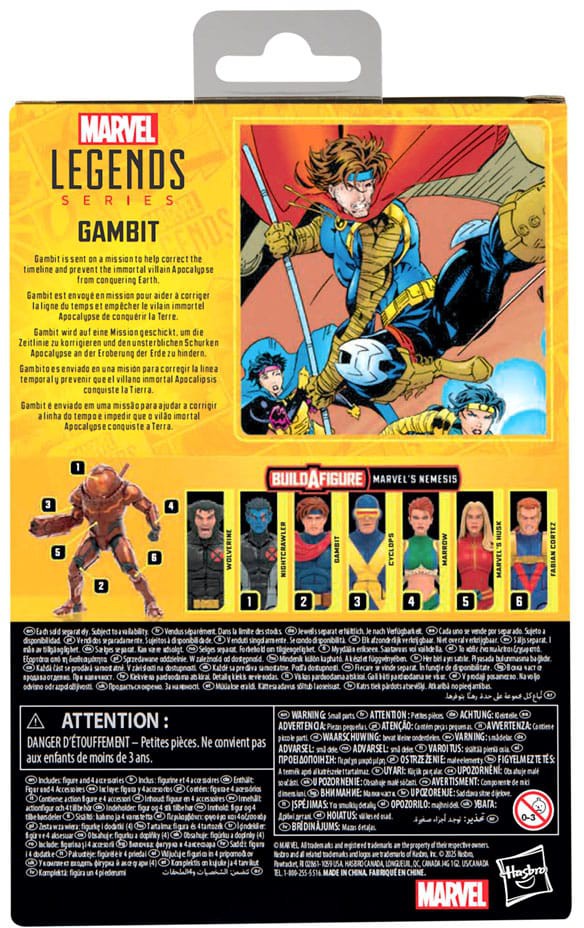 Bring the excitement and wonder of the Marvel Universe to your collection with Hasbro Marvel Legends Gambit X-Men figure! This collectible 6-inch scale Marvel figure is detailed to look like the character from Marvel's Age of Apocalypse comics. Gambit action figure is fully articulated with premium design and poseable head, arms, and legs. Marvel action figure set comes with 3 accessories and 1 Marvel's Nemesis Build-A-Figure piece. Complete the additional figure with Marvel Legends X-Men action figures Nightcrawler, Cyclops, Marrow, Marvel's Husk, and Fabian Cortez. (Each sold separately. Subject to availability.) Hasbro Marvel action figures' 6 inch scale make them great for posing and displaying in fans' collections. Reimagine X-Men comics-inspired scenes on your shelf with Marvel Legends action figures and Marvel collectibles.
