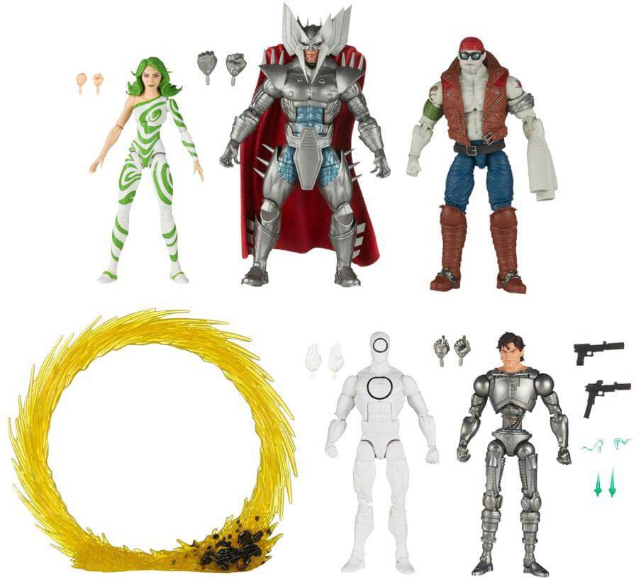 It comes with 15 accessories, including an alternate hands for Marvel's Stryfe and Marvel's Vertigo figures. Marvel's Zero figure includes alternate hands and warp portal accessories. Marvel's Pretty Boy figure includes alternate hands, 2 blasters, 2 blaster effects, and 2 blaster smoke effect accessories.