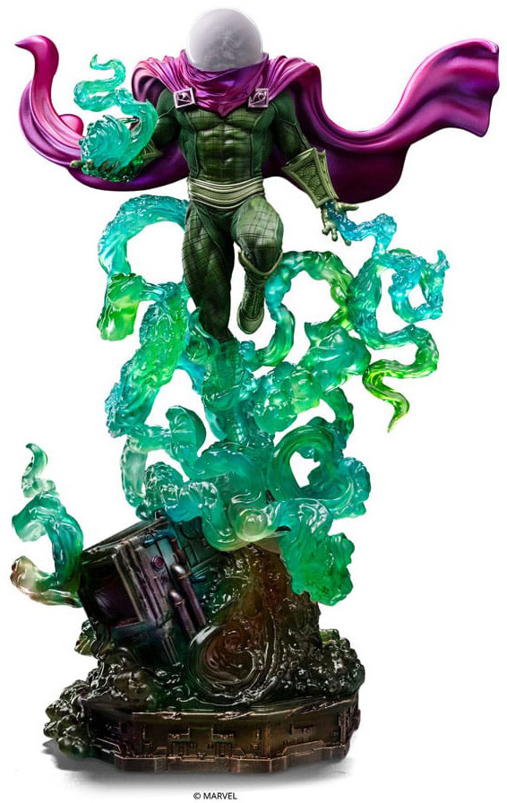Levitating over technological devices and surroun ded by tentacles of an emerald mist that emanates from his left fist and coils arou nd his legs, the villain master of illusionism appear s holding in his right hand a sphere made of the same enigmatic fog that surroun ds him. With his traditional green costume and pur ple cape, with his face hid den inside a moon-shaped globe on his head, his plans to defeat his greatest rival, Spider-Man , are as complex and almost ind ecipherable as the codename he adop ted in his crimin al career. A true master strategist, using holograms, drones, mirr or tricks, and even andr oids in his plans, he joins other great villains of the Friend ly Neigh borhoo d hero in the form of a fantastic statue from Iron Stu dios that presents "Mysterio Deluxe - Sp ider-Man vs Villains Diorama - BDS Art Scale 1/10", adding to anoth er Iron Stu dios dio rama inspired by Mar vel comic books.