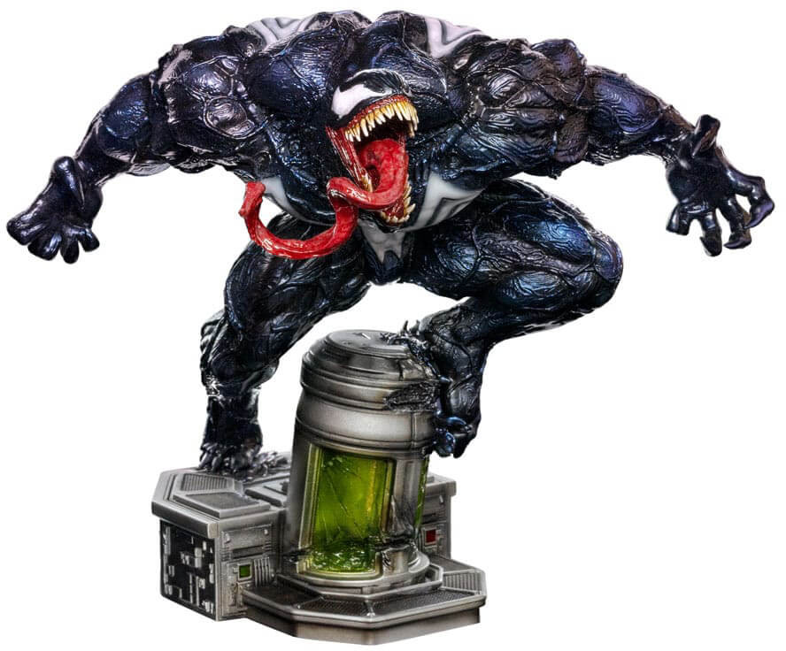 Iron Studios will also bring the Deluxe version "Venom Deluxe - Spider-Man vs Villains - Art Scale 1/10", with a base with tendrils of the tar alien biomass appearing as if they were breaking out from a prison in the shape of a cylindric structure with green stained-glass parts by his feet, next to tentacles that replicate his mouth and teeth at the tips, aiming to capture his prey.