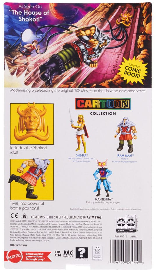 Mattelin Masters of the Universe -sarjasta tulee tämä erittäin nivelletty ja täysin liikuteltava toimintafiguuri. Se on noin 14 cm pitkä, ja sen mukana toimitetaan lisävarusteet läpipainopakkauksessa.