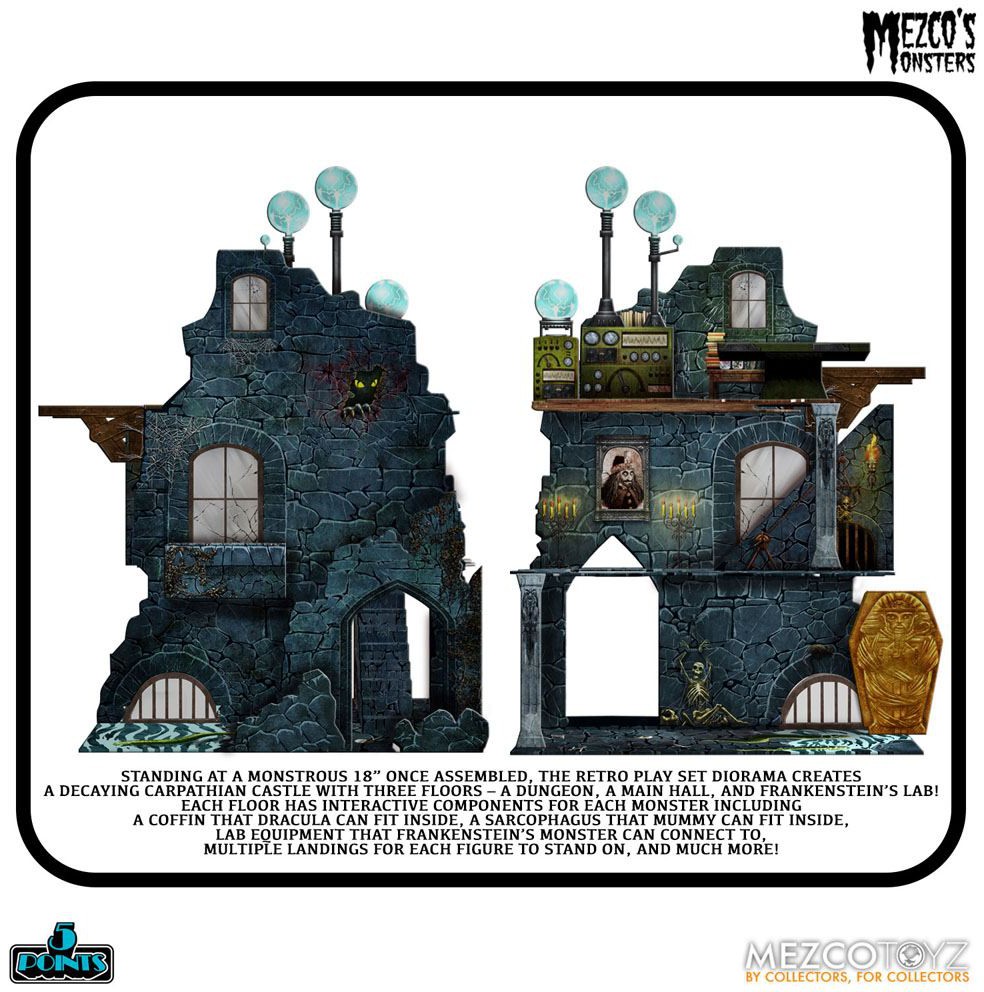 Standing at a monstrous 18" once assembled, the retro play set diorama creates a decaying Carpathian castle with three floors - a dungeon, a main hall, and Frankenstein's Lab! Each floor has interactive components for each Monster including a coffin that Dracula can fit inside, a sarcophagus that Mummy can fit inside, lab equipment that Frankenstein's Monster can connect to, multiple landings for each figure to stand on, and much more!