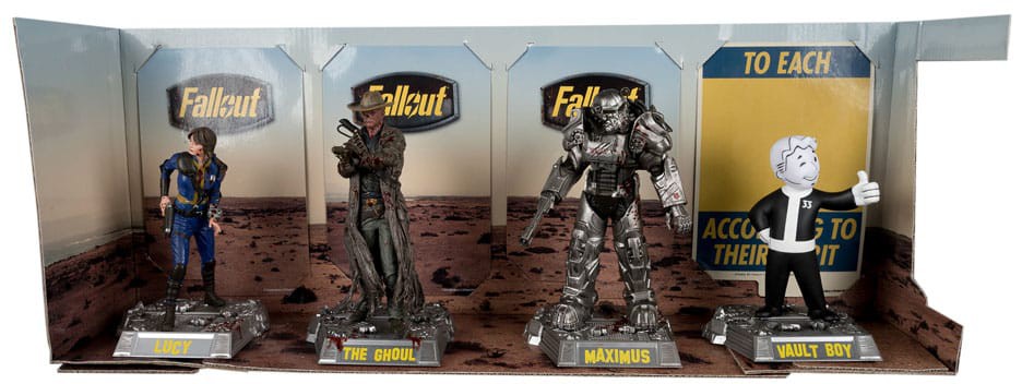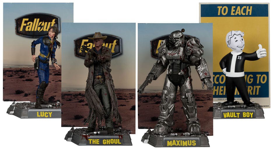 - Uskomattoman yksityiskohtaiset, korkeasti koristellut poseeraushahmot, jotka perustuvat FALLOUT-televisiosarjaan.