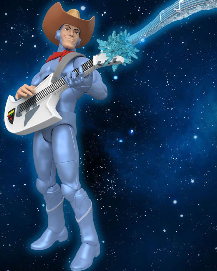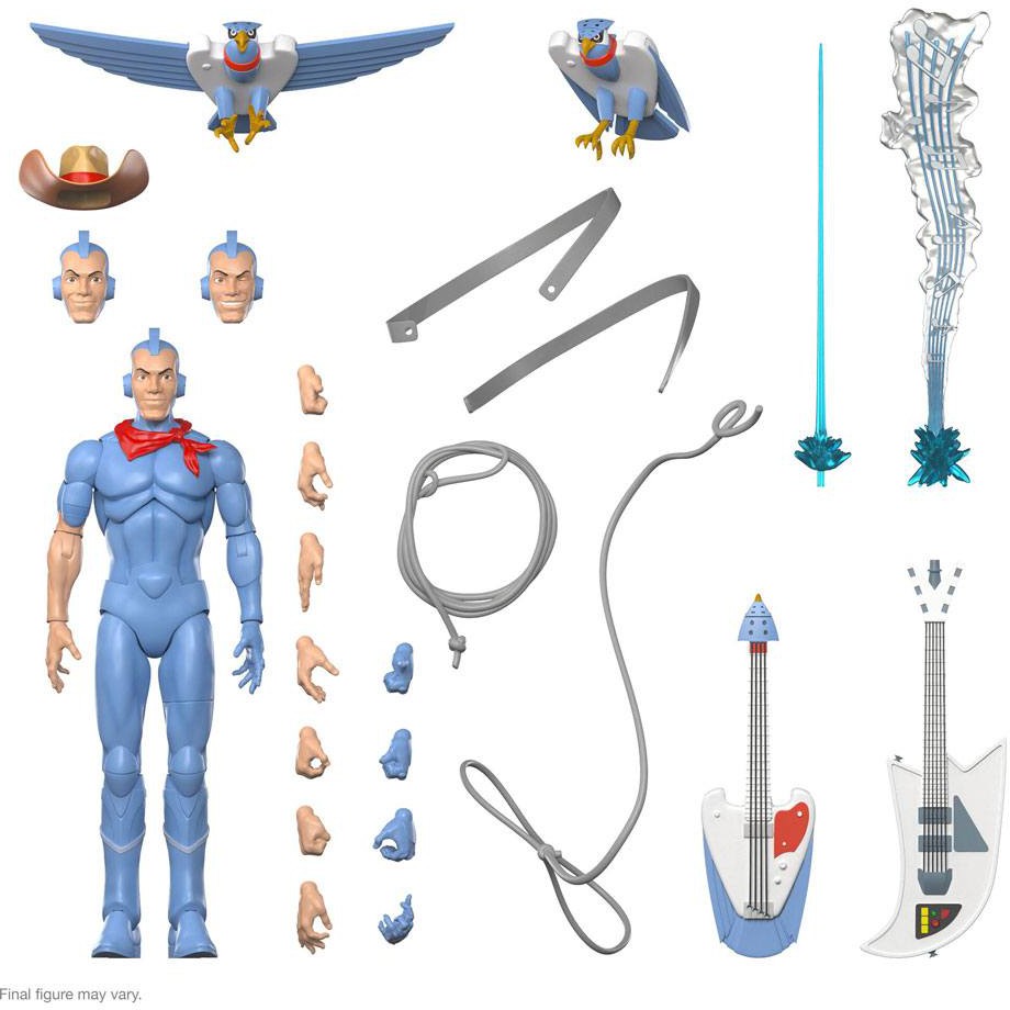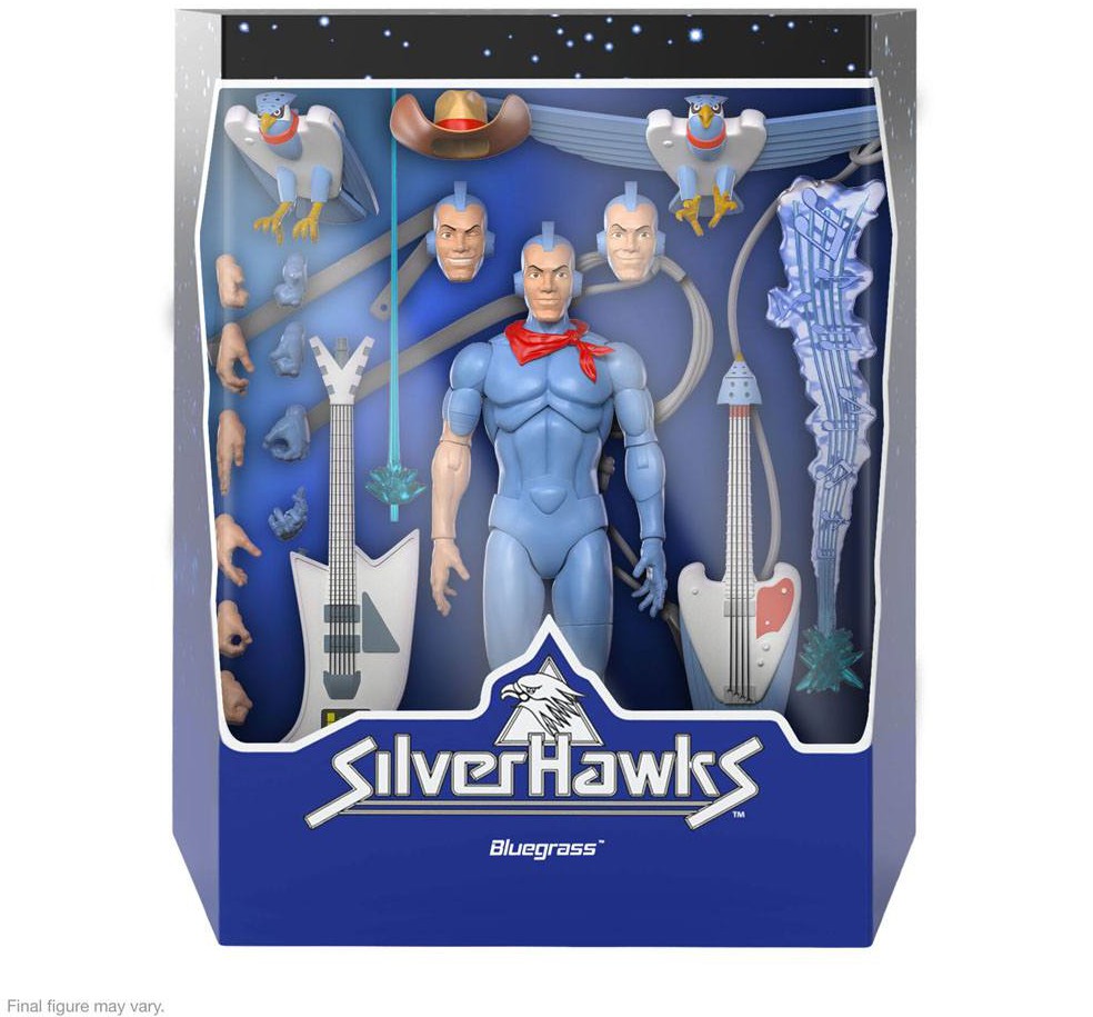 Bluegrass is the only SilverHawk who's cyborg enhancements don't include wings or built-in weapons, but he's an ace pilot who - with his Hot Licks guitar and "bird" partner Sideman - helps keep Limbo safe from Mon*Star and his mobsters! This made-to-order 7" scale fully articulated SilverHawks ULTIMATES! figure of Bluegrass features premium detail and comes with interchangeable heads & hands, and a variety of other accessories, including a Hot Licks guitar, a pair of lassos, and a trio of Side Man figures. Adding Bluegrass to your collection will be just the tuneup that your collection needs, so snag this Bluegrass ULTIMATES! figure before it flies away!