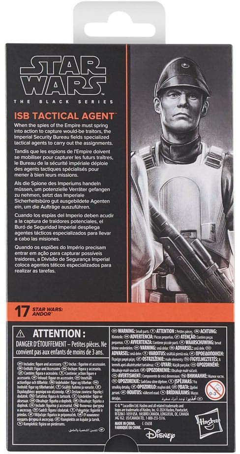 Star Wars The Black Series includes 6 inch action figures, vehicles, and roleplay items from the 40-plus-year legacy of the Star Wars Galaxy, letting fans create galactic scenes with a faithfulness to Star Wars comic books, movies, series, and more. This Star Wars Hasbro action figure is detailed to look like an ISB Tactical Agent from Star Wars: Andor. With exquisite features and decoration, The Black Series embodies the quality and realism that Star Wars devotees love. May the Force be with you!