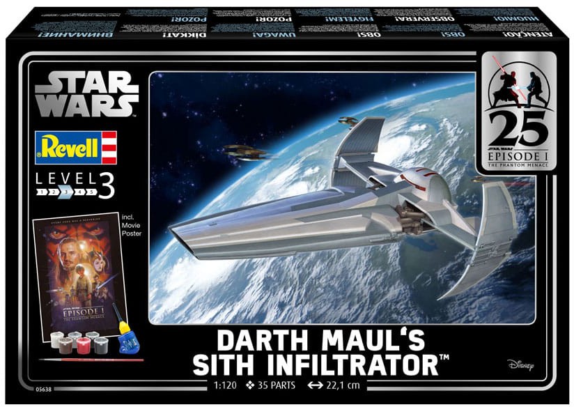 Helppo rakennettava pienoismallisarja Darth Maulin kuuluisasta aluksesta Star Wars Episode 1:stä. Perusvärien lisäksi mukana on liimaa ja siveltimiä.