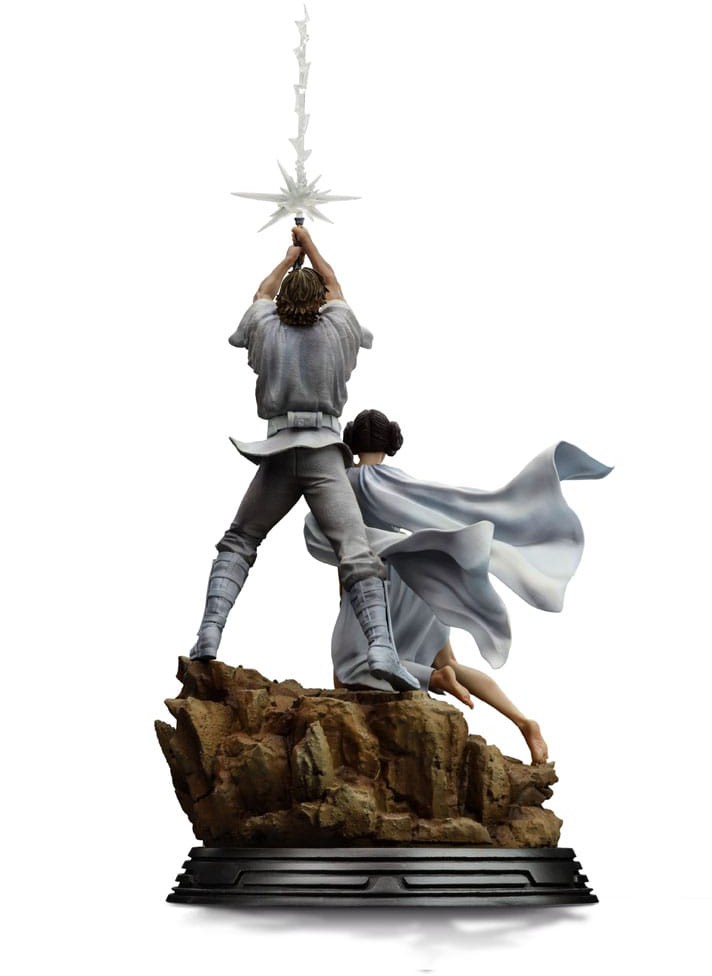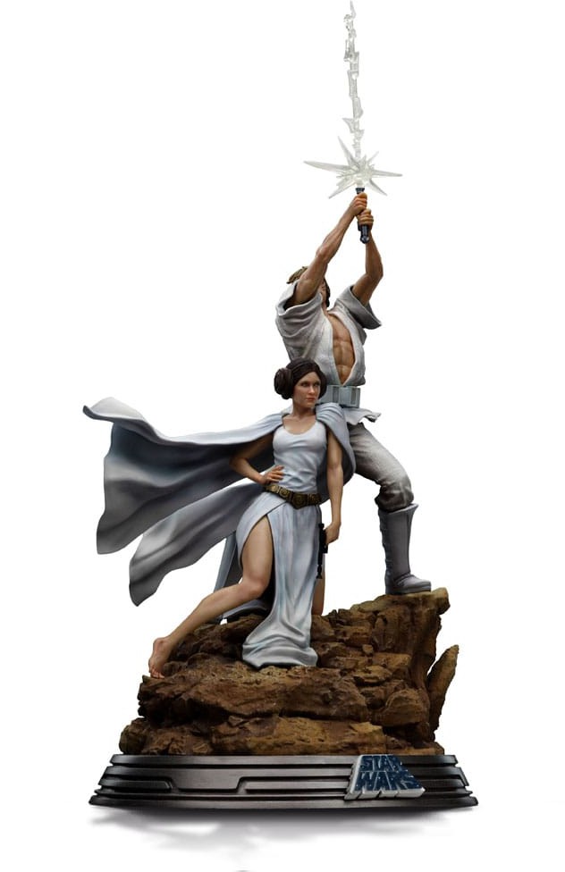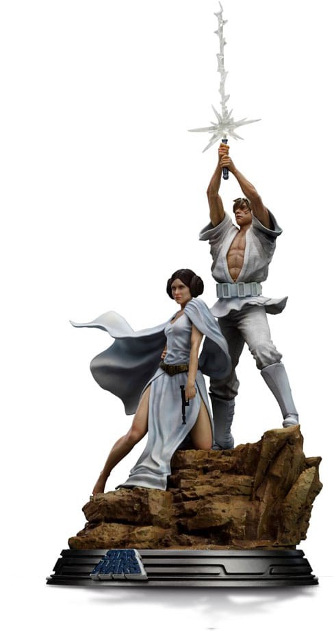 Who are Luke and Leia? Luke Skywalker (Mark Hamill) is the heroic protagonist in the original trilogy of George Lucas' Star Wars franchise. Raised on the planet Tatooine by his paternal aunt and uncle, Luke joins the old Jedi master Obi-Wan Kenobi on a quest to rescue Princess Leia Organa, becoming his apprentice after the Imperial forces kill his family. Luke joins the Rebel Alliance in the fight against the Empire and later discovers that Leia is his twin sister, separated from him as an infant, and that the Sith Lord Darth Vader is actually his father, Anakin Skywalker, who had fallen to the Dark Side of the Force. Princess Leia Organa (Carrie Fisher) is the daughter of Anakin Skywalker and Padmé Amidala, and Luke Skywalker's twin sister. When Padmé died after giving birth to the twins Luke and Leia, and Anakin succumbed to the Dark Side of the Force, becoming the Sith Lord Darth Vader, Leia was secretly adopted by Bail Organa, ruler of the planet Alderaan, to protect her from Vader and his Sith master, Emperor Palpatine. From a young age, Leia joined the Rebel Alliance in the fight against the Empire. Exploring the Luke and Leia Movie Poster statue: Art director, graphic designer, and illustrator Tom Jung is known as the designer for the Style A poster, announcing the release of Star Wars in U.S. movie theaters in 1977. Jung was given a brief of "good versus evil" and provided with a wealth of photos, which ultimately resulted in this iconic work, portraying a stylized Luke Skywalker in a heroic pose, brandishing a glowing Lightsaber above his head, alongside Princess Leia standing below him holding a blaster pistol in her right hand and wearing a flowing white cape behind her. With the two central figures on a rocky base featuring the Star Wars logo at the front, Iron Studios proudly presents the statue, "Luke and Leia Movie Poster - Star Wars - Deluxe Art Scale 1/10," capturing in 3D this iconic image from a galaxy far, far away, which continues to move fans around the world! Jung's work was reimagined and reproduced by the Brothers Hildebrandt for the Star Wars release in the UK as the Style B poster, followed by the Style C poster designed by Tom Chantrell. Figure details: The statue is produced with the utmost attention and care, based on official references, which ensures an impressive display of the figure in any environment. Special features: The statue Luke and Leia Movie Poster - Star Wars - Deluxe Art Scale 1/10 will be produced in limited edition. The diorama base presents rich details inspired by the original references. Materials and finishing of the piece: Just like all the other statues manufactured by Iron Studios, the statue Luke and Leia Movie Poster - Star Wars - Deluxe Art Scale 1/10 is made with high-quality materials such as Polystone and may contain parts in resin, PVC, metal, and fabric. For the finishing, the hand-painted statue ensures a unique and exclusive artistic touch to satisfy any collector. Now available for Pre-order, revealed at D23 Brazil, a must-have for Star Wars fans and Force-attuned collectors! Check out the other upcoming release "Darth Vader - Star Wars - Minico," a long-awaited statue by fans, marking the first Star Wars statue in the MiniCo line.