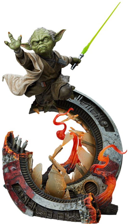 Witness a master rising! The Yoda Mythos Statue measures 17" tall and 11.75" wide, capturing a glimpse of the agile and enigmatic alien during his younger days as a galactic peacekeeper. 900 years old he is not, as he leaps through the smoldering, shattered wreckage of a ship's hull with ease in this gravity-defying pose. His lightsaber™ is extended and his arm is outstretched as the fierce battle continues. Though short of stature, Yoda proves that even the smallest being can make the biggest impact through the living Force.