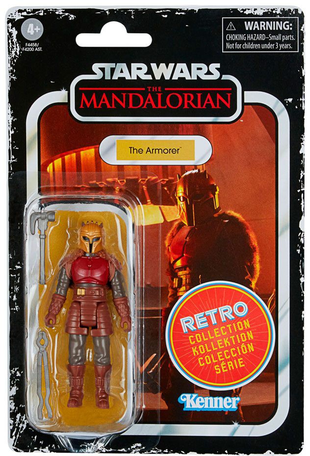 The 3.75-inch-scale Retro Collection figure is detailed to look like The Armorer character from Star Wars: The Mandalorian live-action series on Disney Plus, featuring design and detailing inspired by 1970s Star Wars figures.
