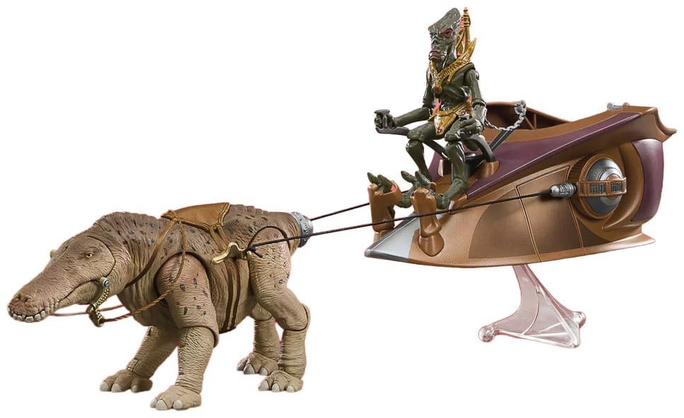 The included arena cart comes with attachable reins for the orray’s saddle, and the Geonosian Picador can be posed on the cart.
