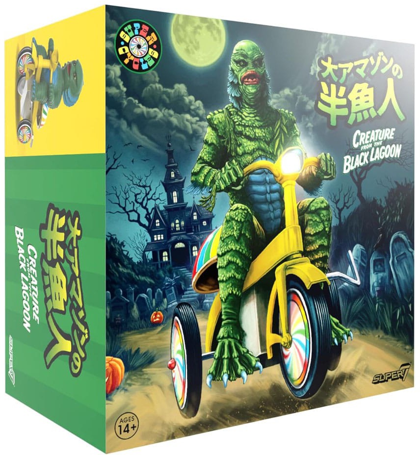 Esitä kysymyksesi tuotteesta "Super Cycles: Universal Monsters - Creature from the Black Lagoon (Dark Green with Yellow Trike)".