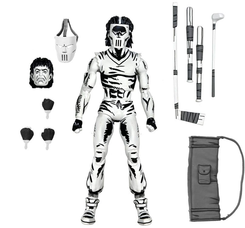Featuring a black-and-white paint deco for a comic-authentic look, Casey stands approximately 7 inches tall and includes interchangeable heads and hands, plus hockey mask, golf bag, bats, hockey stick, and golf club!