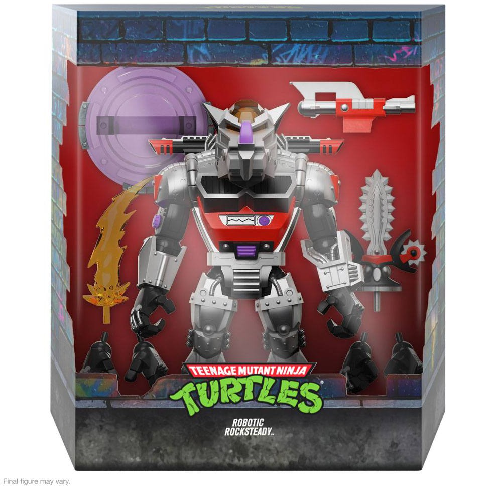 When Shredder makes a cybernetic clone of his henchman, the stronger and more intelligent Robotic Rocksteady means the Ninja Turtles have a new mechanical menace to deal with! This 8" highly articulated Teenage Mutant Ninja Turtles ULTIMATES! Robotic Rocksteady figure comes with interchangeable hands and a variety of other accessories, including his Laser Blade, Cyber Sewer Shield, and more. The made-to-order Robotic Rocksteady ULTIMATES! figure is ready to charge headfirst into your collection!
