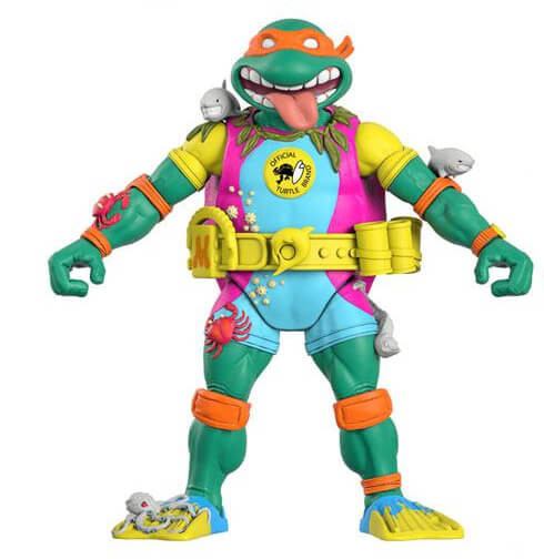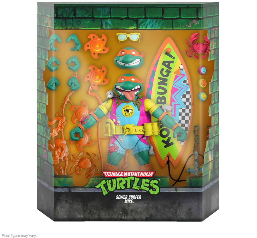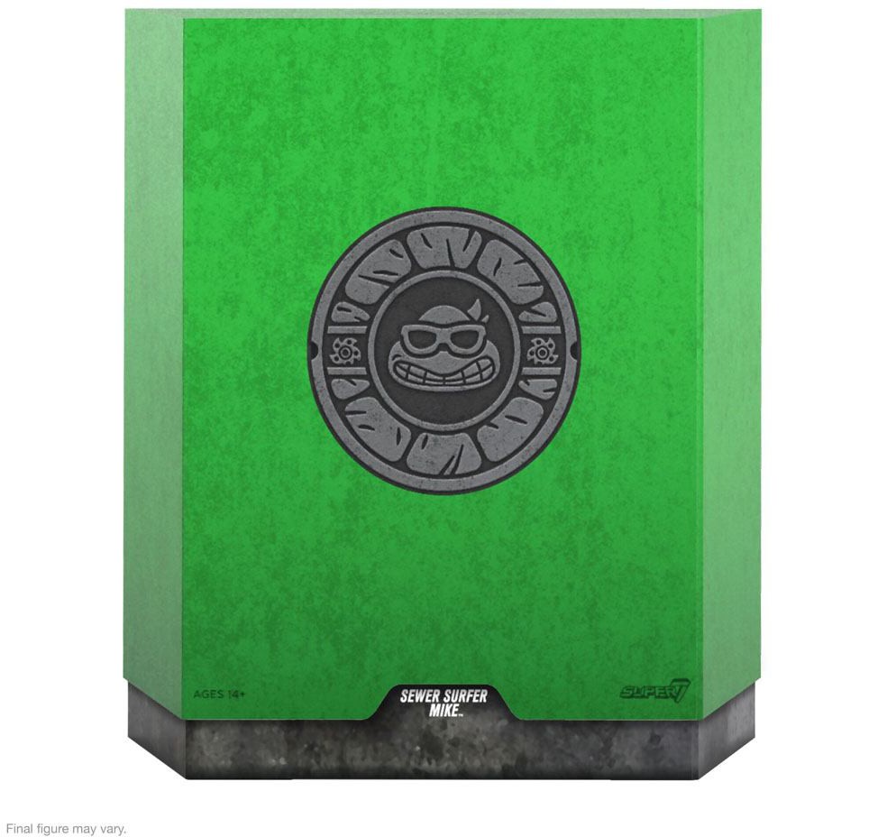 This 7" scale fully articulated Teenage Mutant Ninja Turtles ULTIMATES! figure of Sewer Surfer Mike features super gnarly surfer gear detail and comes with interchangeable heads and hands, as well as iconic accessories, including his Sewer Worthy Surfboard, Seaweed Nunchucks, and a weapon rack in case he has to wipe out some baddies while hangin' FOUR! The sewers may not exactly be Hawaii's North Shore Pipeline, but they are a LITERAL pipeline, and Michelangelo wouldn't have it any other way. Don't wave away the chance to add the Teenage Mutant Ninja Turtles ULTIMATES! Sewer Surfer Mike figure to your collection!