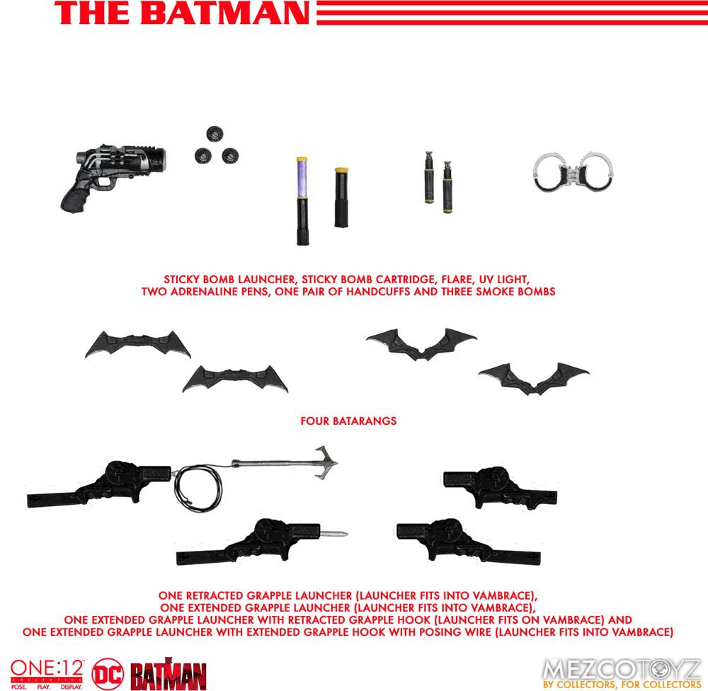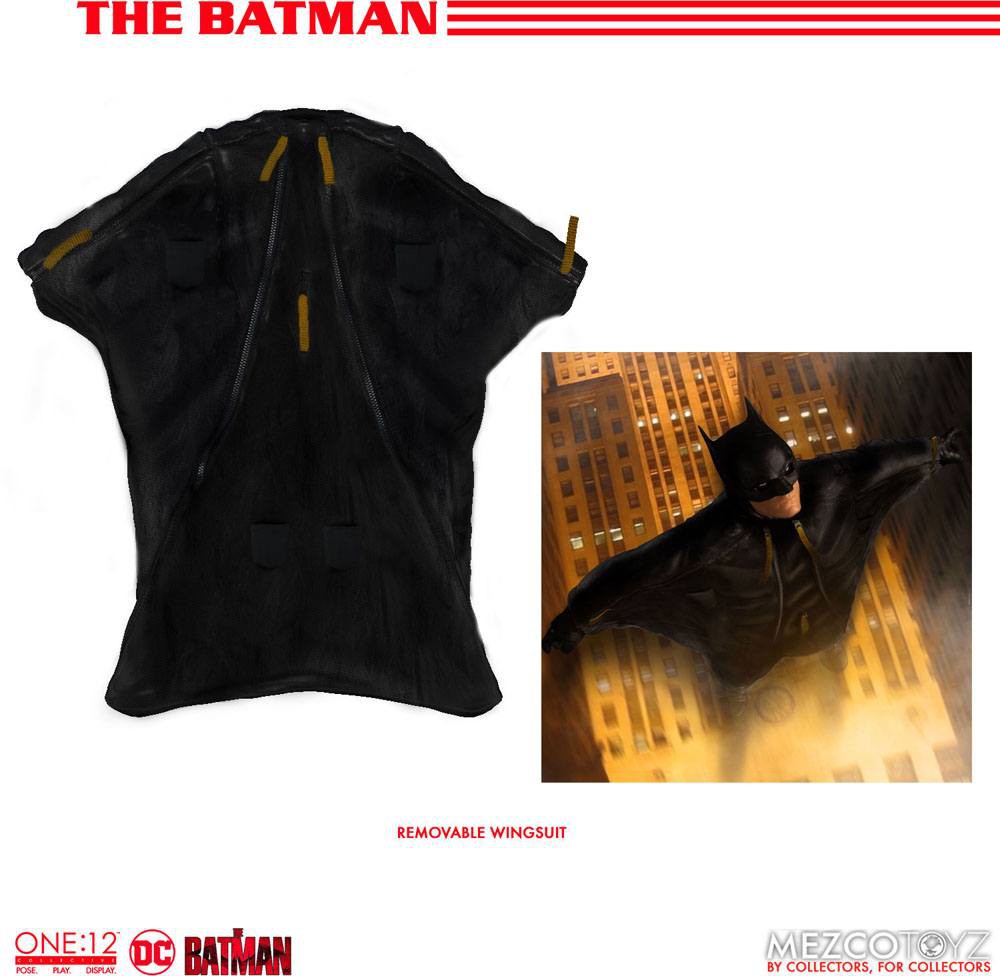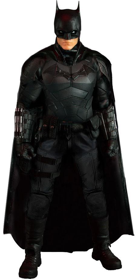 The Batman is outfitted in a screen-accurate armored Batsuit with chest insignia. The costume features an integrated posing wire in the cape, utility belt, a thigh pouch, and two vambrace. Batman comes complete with four head portraits including an unmasked Bruce Wayne portrait, all featuring the likeness of actor Robert Pattinson.