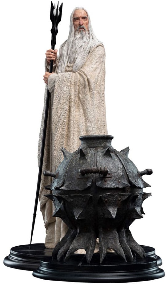 - Saruman the White is presented in his signature pose and clothing, as seen in The Lord of the Rings Trilogy;