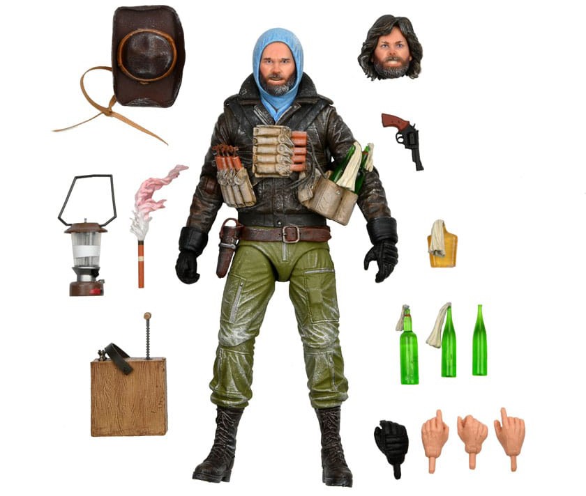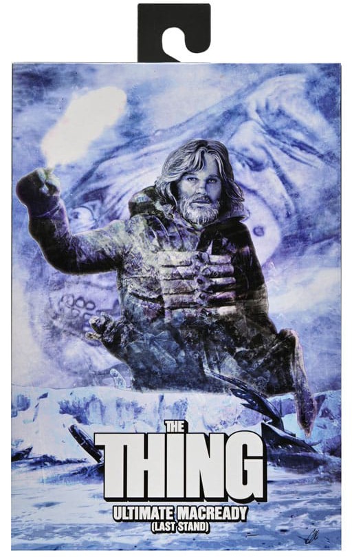 From The Thing, John Carpenter's acclaimed slow-build horror film classic! R.J. MacReady is a member of a 12-man research team which finds something that's been waiting for over 100,000 years in the Antarctic circle. Featuring the official likeness of Kurt Russell, Ultimate Last Stand MacReady stands approximately 7 inches tall and is kitted out to wage war on an alien imposter. Includes interchangeable heads, swappable hands, hat, Molotov cocktails that fit in a harness, revolver that fits in a holster, lantern, lit flare, and detonator.